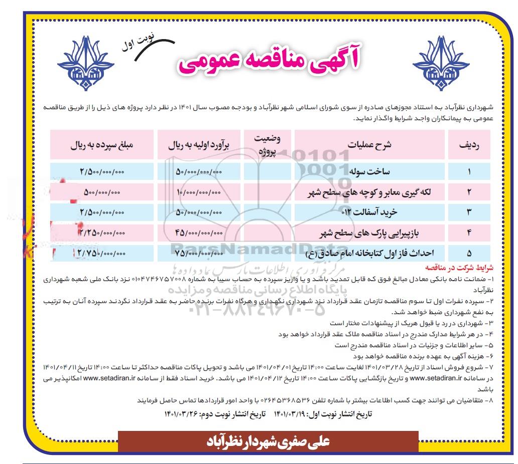 شهرداری نظرآباد به استناد مجوزهای صادره از سوی شورای اسلامی شهر نظرآباد و بودجه مصوب سال 1401 در نظر دارد پروژه های ذیل را از طریق مناقصه عمومی به پیمانکاران واجدالشرایط واگذار نماید.