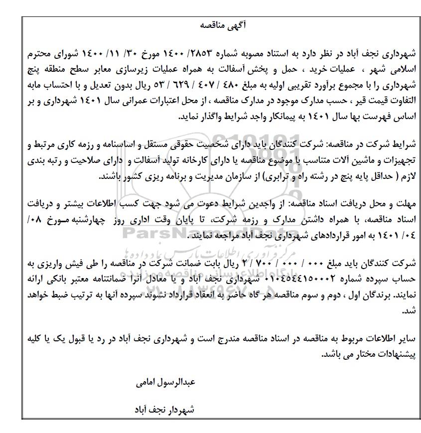 شهرداری نجف آباد به استناد مصوبه شماره 1400/2853 مورخ 1400.11.30  شورای محترم اسلامی شهر، عملیات خرید، حمل و پخش آسفالت به همراه عملیات زیرسازی معابر سطح منطقه پنج شهرداری را با مچجموع برآورد تقریبی اولیه به مبلغ 53.629.407.480 ریال بدون تعدیل و با احتساب مابه التفاوت قیمت قیر ، حسب مدارک موجود در مدارک مناقصه از محل اعتبارات عمرانی سال 1401 شهرداری و براساس فهرست بها سال 1401 به پیمانکار واجد شرایط واگذار نماید