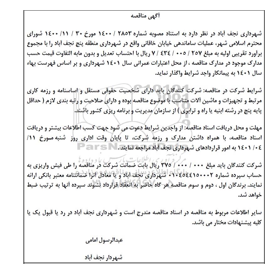 شهرداری نجف آباد در نظر دارد به استناد مصوبه شماره 1400/2853 مورخ 1400.11.30 شورای محترم اسلامی شهر، عملیات ساماندهی خیابان خاقانی واقع در شهرداری منطقه 5 نجف آباد را با مجموع برآورد تقریبی اولیه به مبلغ 7.434.005.257 ریال با احتساب تعدیل و بدون مابه التفاوت قیمت حسب مدارک موجود در مدارک مناقصه،از محل اعتبارات عمرانی سال 1401 شهرداری و براساس فهرست بها سال 1401 به پیمانکار واجد شرایط واگذار نماید