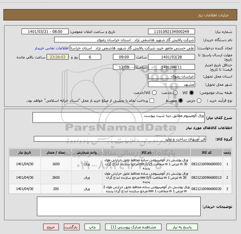 نام دستگاه خریدار:شرکت پالایش گاز شهید هاشمی نژاد استان خراسان رضوی