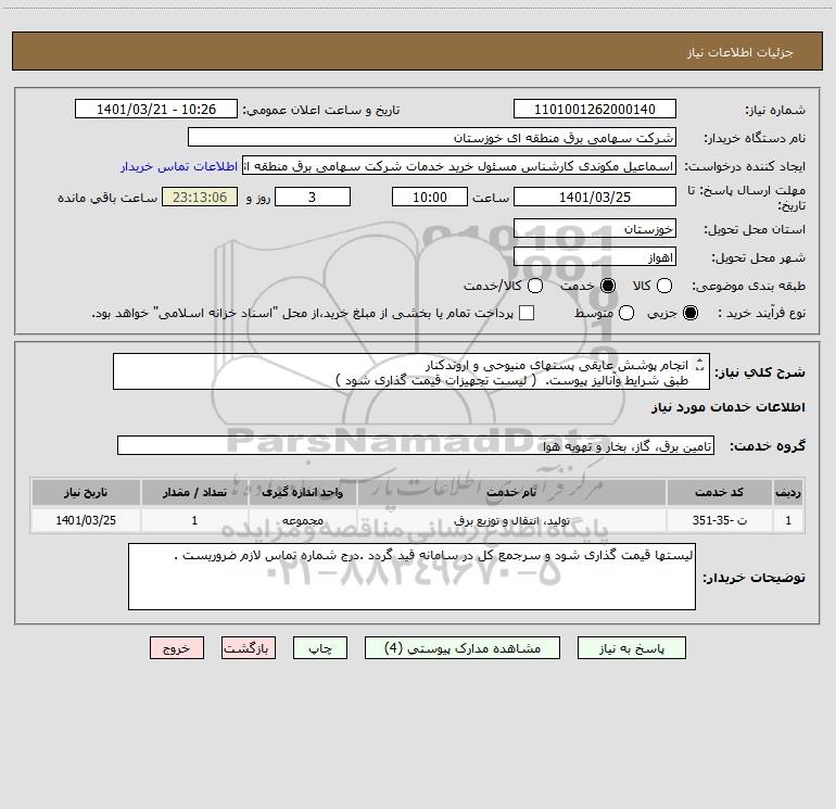 شرح کلی نیاز: انجام پوشش عایقی پستهای منیوحی و اروندکنار طبق شرایط وآنالیز پیوست. ( لیست تجهیزات قیمت گذاری شود )