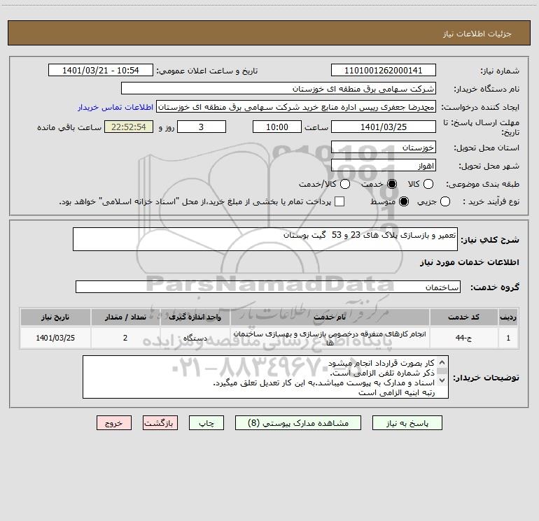 شرح کلی نیاز: تعمیر و بازسازی پلاک های 23 و 53 گیت بوستان
