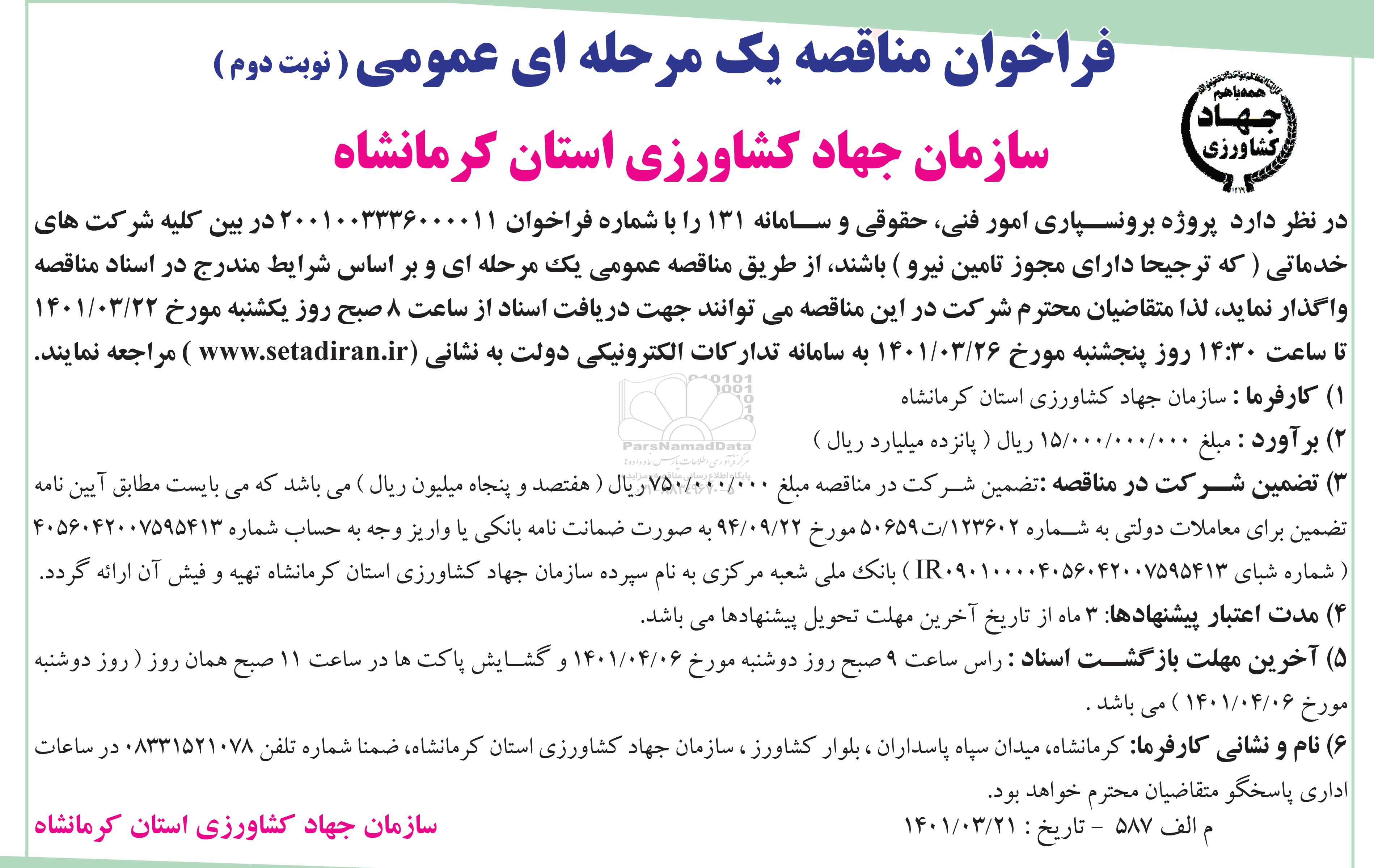 سازمان جهاد کشاورزی استان کرمانشاه در نظر دارد پروژه برونسپاری امور فنی، حقوقی و سامانه 131 را با شماره فراخوان 2001003336000011 در بین کلیه شرکت های خدماتی (که ترجیحا دارای مجوز تامین نیرو) باشند از طریق مناقصه عمومی یک مرحله ای و براساس شرایط مندرج در اسناد مناقصه واگذار نماید لذا متقاضیان منحترم شرکت در این مناقصه می توانند جهت دریافت اسناد از ساعت 8 صبح روز یکشنبه مورخ 1401.3.22 تا ساعت 14/30 روز پنجشنبه مورخ 1401.3.26 به سامانه تدارکات الکترونیکی دولت ستاد ایران مراجعه نمایند