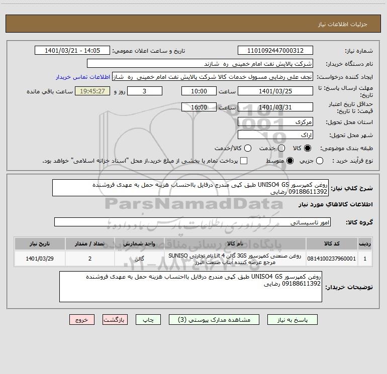 شرح کلی نیاز: روغن کمپرسور UNISO4 GS طبق کپی مندرج درفایل بااحتساب هزینه حمل به عهدی فروشنده 09188611392 رضایی