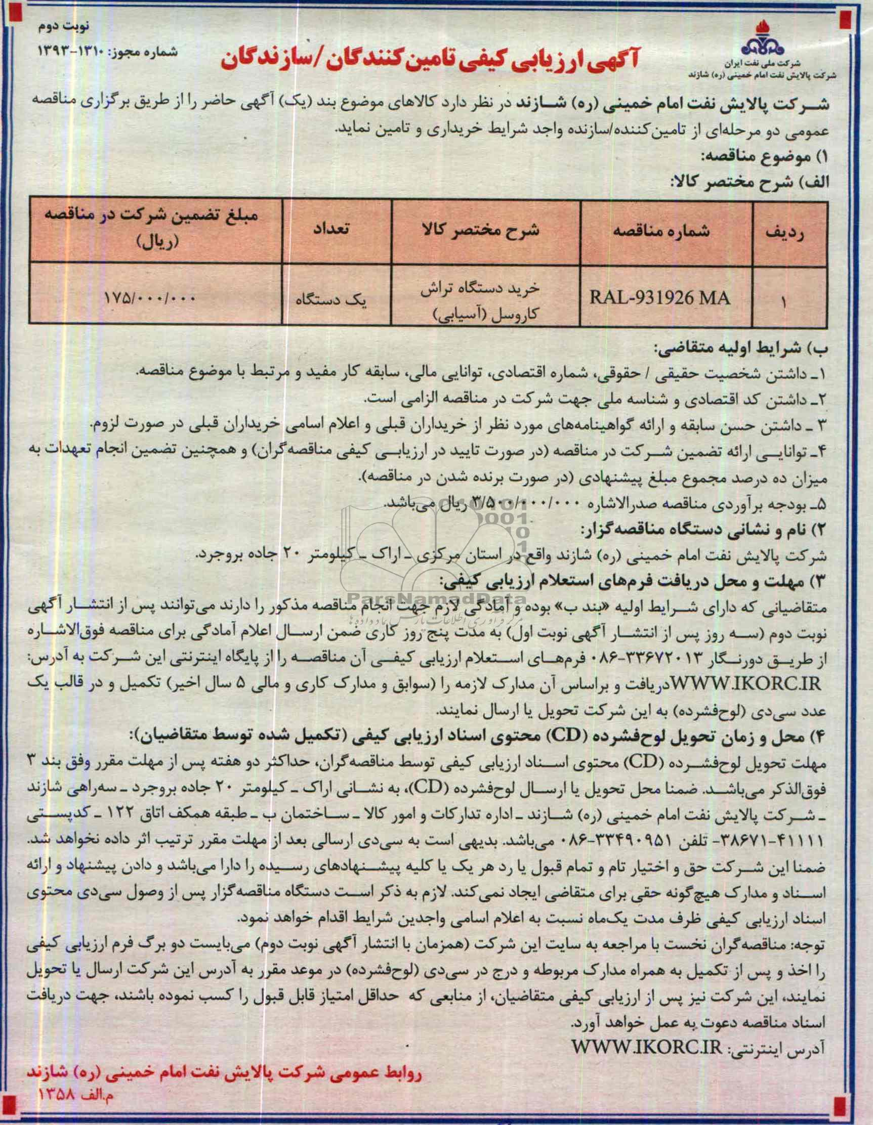 مناقصه خرید دستگاه تراش کاروسل , آگهی ارزیابی کیفی تامین کنندگان , مناقصه خرید دستگاه تراش کاروسل