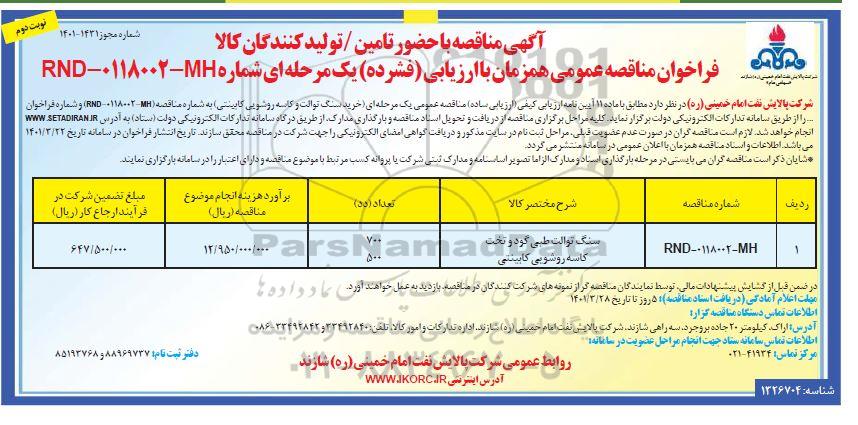 شرکت پالایش نفت امام خمینی (ره) شازند در نظر دارد مطابق با ماده 11 آیین نامه ارزیابی کیفی /ارزیابی ساده / مناقصه عمومی یک مرحله ای (خرید سنگ توالت و کاسه روشویی کابینتی) به شماره مناقصه RND-0118002-MH و شماره فراخوان... را از طریق سامانه تدارکات الکترونیکی دولت برگزار نماید. کلیه مراحل برگزاری فراخوان ارزیابی کیفی از دریافت و تحویل اسناد استعلام ارزیابی کیفی تا ارسال دعوتنامه جهت سایر مراحل مناقصه از طریق درگاه سامانه تدارکات الکترونیکی دولت ستاد به آدرس ستاد ایران انجام خواهد شد . لازم است مناقصه گران در صورت عدم عضویت قبلی مراحل ثبت نام در سایت مذکور و دریافت گواهی امضای الکترونیکی را جهت شرکت در مناقصه محقق سازند. تاریخ انتشار فراخوان در سامانه تاریخ 1401.3.22 می باشد. اطلاعات و اسناد مناقصه همزمان با اعلان عمومی در سامانه منتشر می گردد.