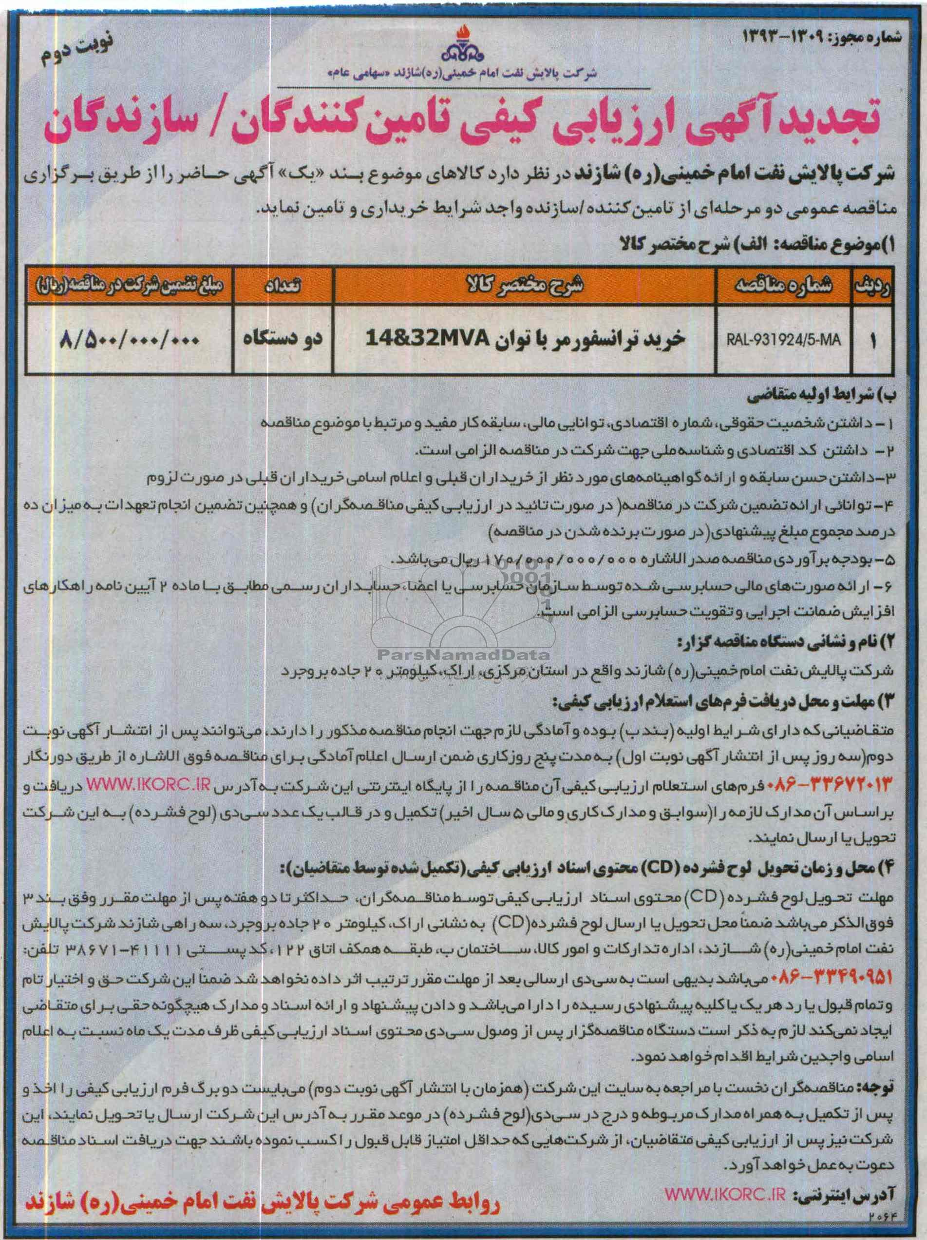 تجدید مناقصه خرید ترانسفورماتور با توان 14&32MVA از کلیه افراد متخصص و شرکتها واجد شرایط دعوت به عمل میآید در مناقصه با کد خبرگزاری پارس نماد: 460001 شرکت نمایند.