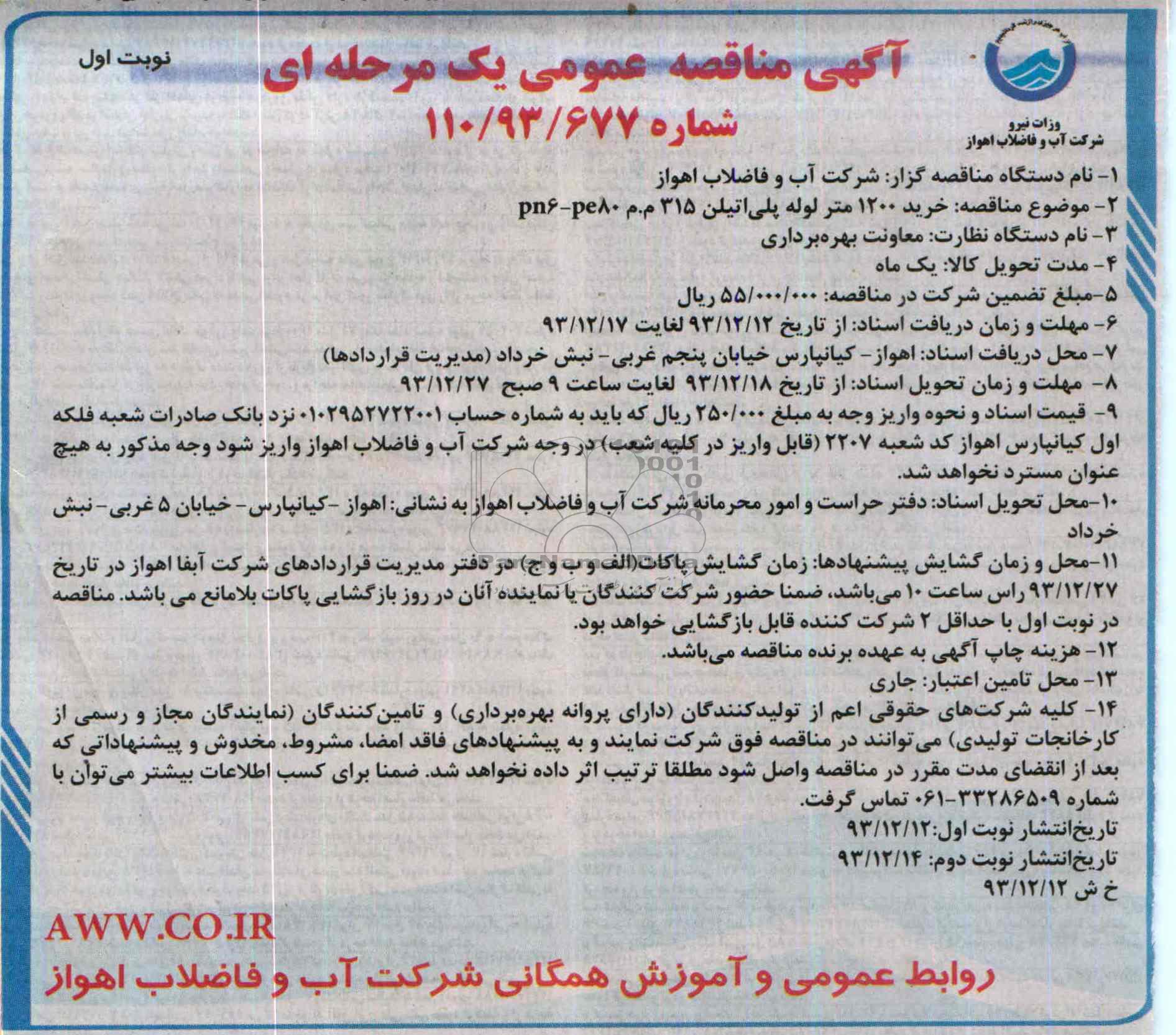خرید 1200 متر لوله پلی اتیلن 315 م .م -PN6-PE80مناقصه از کلیه افراد متخصص و شرکتها واجد شرایط دعوت به عمل میآید در مناقصه با کد خبرگزاری پارس نماد: 460014 شرکت نمایند.