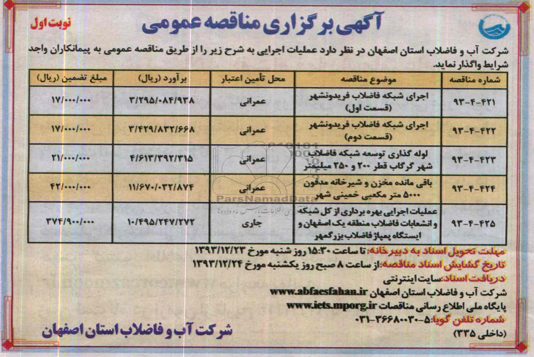 | 93-4-421 | اجرای شبکه فاضلاب فریدونشهر قسمت اول |