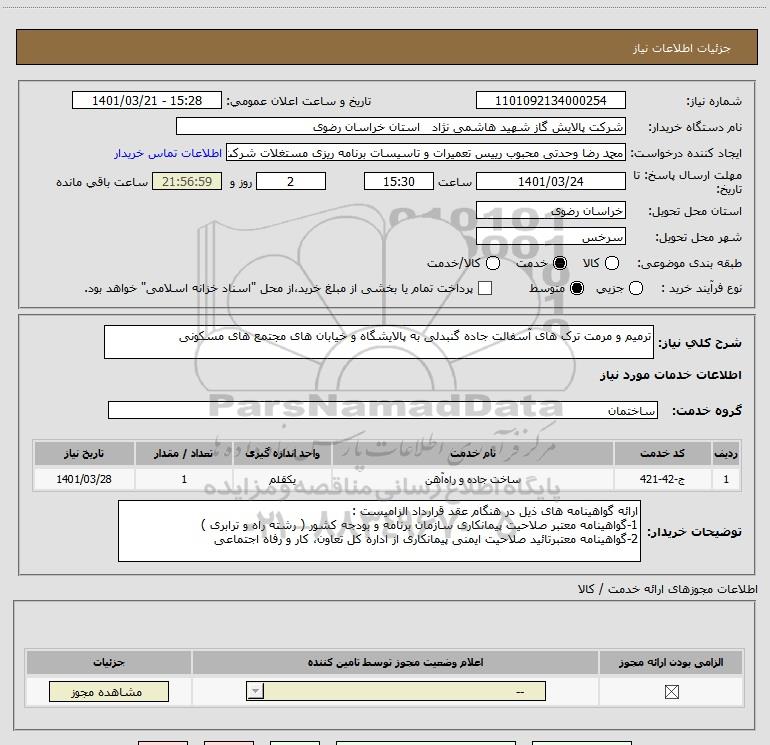 نام دستگاه خریدار:شرکت پالایش گاز شهید هاشمی نژاد استان خراسان رضوی