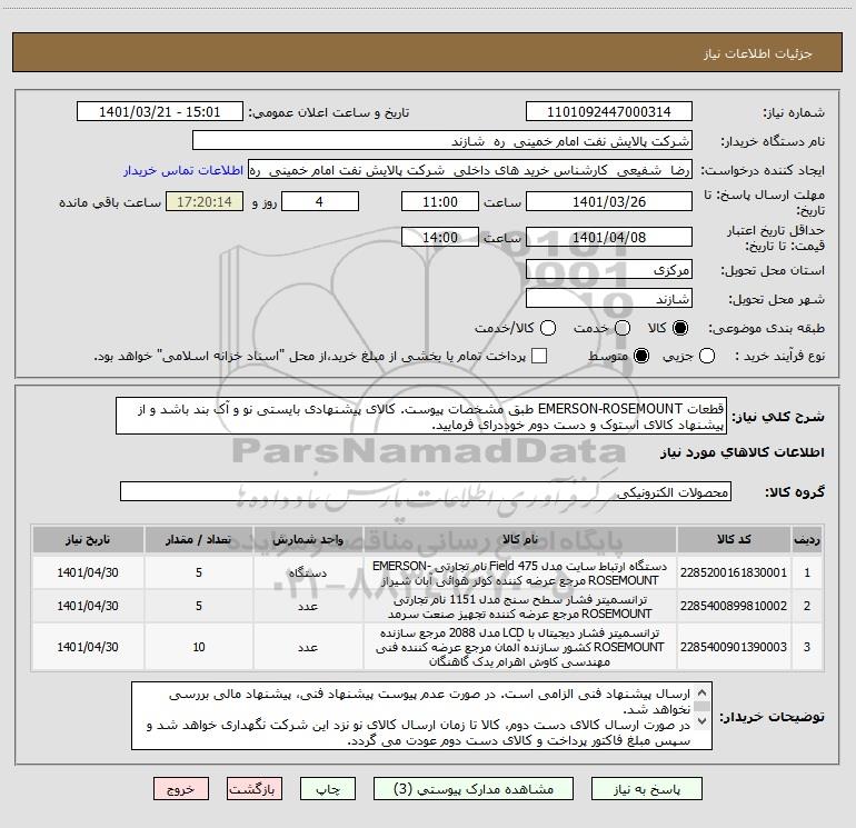 شرح کلی نیاز: قطعات EMERSON-ROSEMOUNT طبق مشخصات پیوست. کالای پیشنهادی بایستی نو و آک بند باشد و از پیشنهاد کالای استوک و دست دوم خوددرای فرمایید.