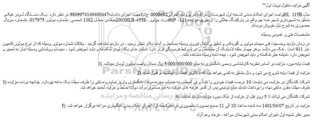 واحد اجرای احکام مدنی شعبه اول شهرستان مراغه در پرونده اجرایی0000662 ج/م1جهت اجرای دادنامه9809974149400447 در نظر دارد یک دستگاه لودر هپکو HL 115B-مدل 2003میلادی معادل 1382 شمسی -بشماره موتور 037975- بشماره سریال HLB-455E-قدرت موتور HP -121 متعلق به شهرداری شهر خدا جو واقع در پارکینگ جلالی را از طریق مزایده حضوری به شرح ذیل بفروش برساند.