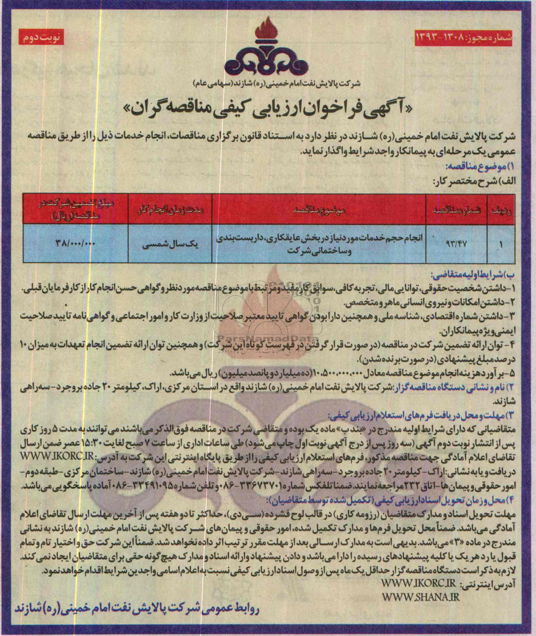| 93/47 | انجام حجم خدمات مورد نیاز در بخش عایقکاری، داربست بندی و ساختمانی شرکت |