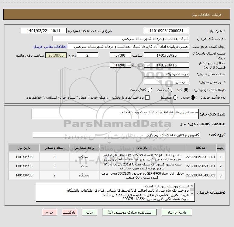 نام دستگاه خریدار:شبکه بهداشت و درمان شهرستان سرخس