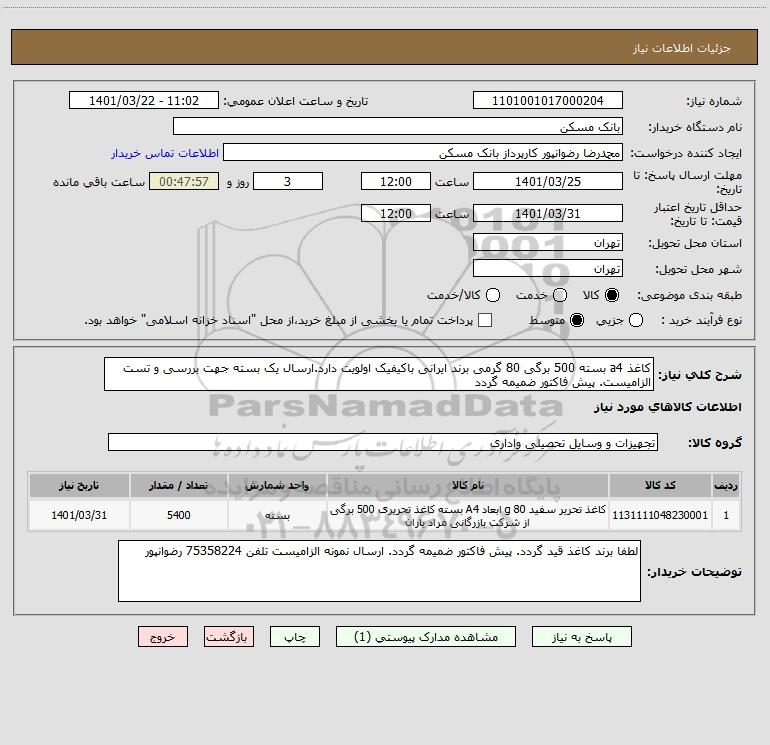 شرح کلی نیاز: کاغذ a4 بسته 500 برگی 80 گرمی برند ایرانی باکیفیک اولویت دارد.ارسال یک بسته جهت بررسی و تست الزامیست. پیش فاکتور ضمیمه گردد