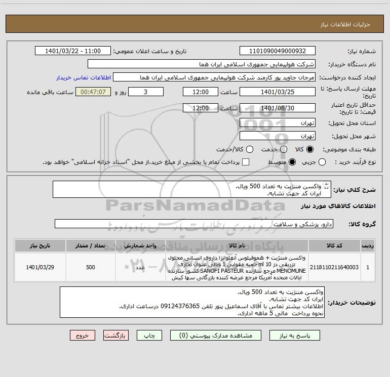 توضیحات خریدار:واکسن مننژیت به تعداد 500 ویال. ایران کد جهت تشابه. اطلاعات بیشتر تماس با آقای اسماعیل پنور تلفن 09124376365 درساعت اداری. نحوه پرداخت مالی 5 ماهه اداری.