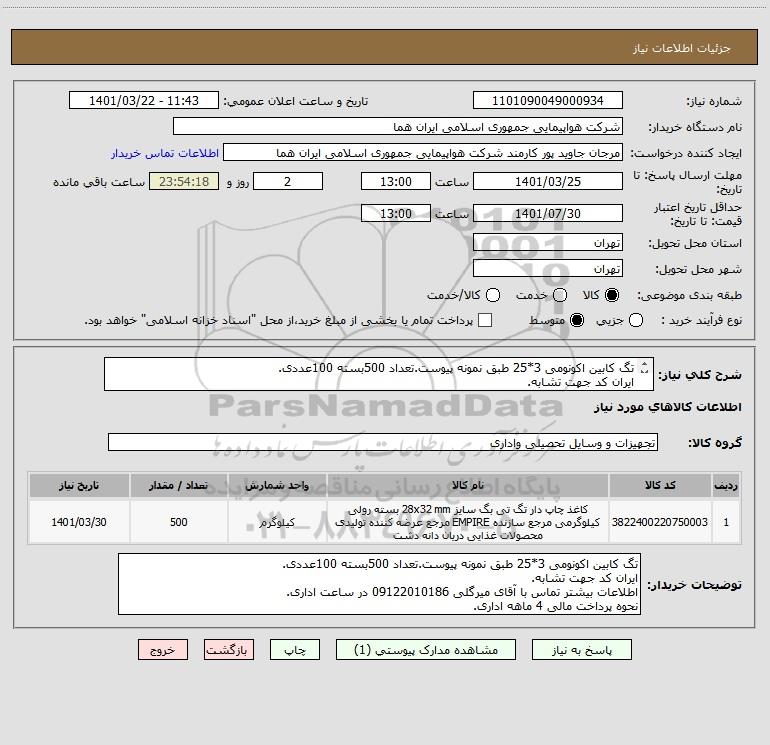 شرح کلی نیاز: تگ کابین اکونومی 3*25 طبق نمونه پیوست.تعداد 500بسته 100عددی.