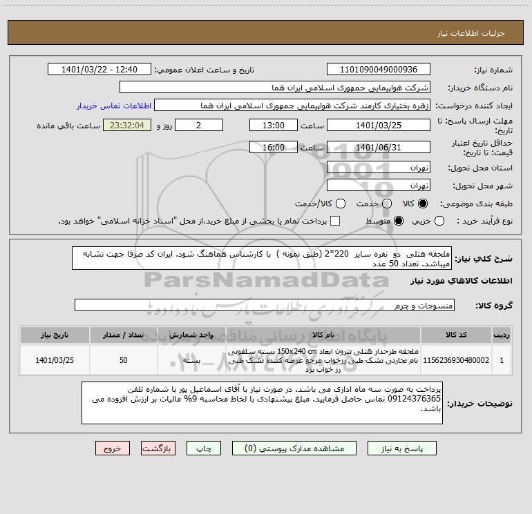 شرح کلی نیاز: ملحفه هتلی دو نفره سایز 220*2 (طبق نمونه ) با کارشناس هماهنگ شود. ایران کد صرفا جهت تشابه میباشد. تعداد 50 عدد