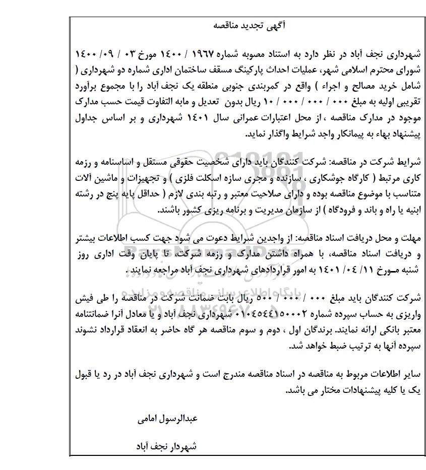 شهرداری نجف آباد در نظر دارد عملیات احداث پارکینگ مسقف ساختمان اداری شماره دو شهرداری (شامل خر ید مصالح و اجراء ) واقع در کمربندی جنوبی منطقه یک نجف آباد را با مجموع برآورد تقریبی اولیه به مبلغ 10.000.000.000ریال بدون تعدیل و با احتساب مابه التفاوت قیمت حسب مدارک موجود در مدارک مناقصه از محل اعتبارات عمرانی سال 1401 به شهرداری و براساس جداول پیشنهاد بها به پیمانکار واجد شرایط واگذار نماید.