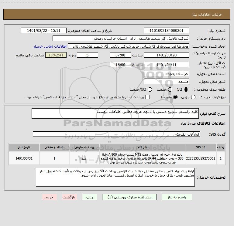 نام دستگاه خریدار:شرکت پالایش گاز شهید هاشمی نژاد استان خراسان رضوی