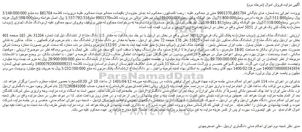 پرونده اجرایی به شماره های بایگانی 861704و9901370 مبنی بر محکوم علیه : رضا کنعانپور، محکوم له :جابر جاویدان باقیمانده محکو میت محکوم علیه درپرونده کلاسه 861704 به مبلغ 3/149/000/000 ریال ومبلغ7/511/800ریال هزینه دادرسی ومبلغ75/800/000ریال حق الوکاله وکیل ومبلغ189/000/000ریال نیم عشر دولتی در پرونده کلاسه9901370 مبلغ1/537/792/316 ریال اصل خواسته ومبلغ5/598/000ریال هزینه دادرسی ومبلغ57/558/000ریال حق الوکاله وکیل ومبلغ139/881/815ریال نیم عشر دولتی درحق صندوق دولت،باتوجه به درخواست محکوم له مبنی برتوقیف وفروش سهم محکوم علیه ازدودانگ ملک تجاری (دوباب مغازه) به پلاک ثبتی یک فرعی از 5051 اصلی واقع در بخش دو اردبیل به شرح زیر ارزیابی و برآورد قیمت شده است؛