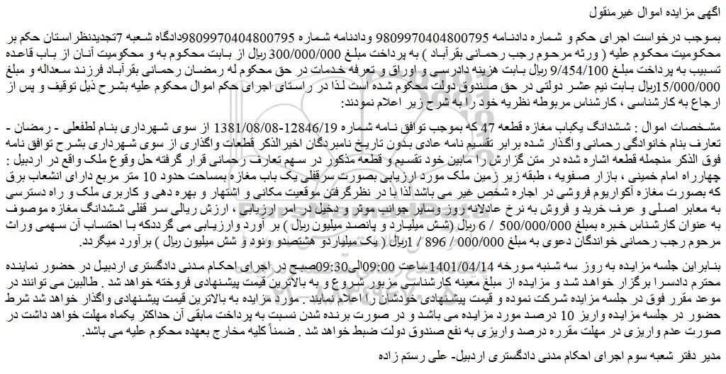 مشخصات اموال : ششدانگ یکباب مغازه قطعه 47 که بموجب توافق نامه شماره 12846/19-1381/08/08 از سوی شهرداری بنام لطفعلی - رمضان - تعارف بنام خانوادگی رحمانی واگذار شده برابر تقسیم نامه عادی بدون تاریخ نامبردگان اخیرالذکر قطعات واگذاری از سوی شهرداری بشرح توافق نامه فوق الذکر منجمله قطعه اشاره شده در متن گزارش را مابین خود تقسیم و قطعه مذکور در سهم تعارف رحمانی قرار گرفته حل وقوع ملک واقع در اردبیل : چهارراه امام خمینی ، بازار صفویه ، طبقه زیر زمین ملک مورد ارزیابی بصورت سرقفلی یک باب مغازه بمساحت حدود 10 متر مربع دارای انشعاب برق که بصورت مغازه آکواریوم فروشی در اجاره شخص غیر می باشد لذا با در نظرگرفتن موقعیت مکانی و اشتهار و بهره دهی و کاربری ملک و راه دسترسی به معابر اصلی و عرف خرید و فروش به نرخ عادلانه روز وسایر جوانب موثر و دخیل در امر ارزیابی ، ارزش ریالی سر قفلی ششدانگ مغازه موصوف به عنوان کارشناس خبره بمبلغ 500/000/000 / 6 ریال (شش میلیارد و پانصد میلیون ریال ) بر آورد وارزیابی می گرددکه با احتساب آن سهمی وراث مرحوم رجب رحمانی خواندگان دعوی به مبلغ 000/000 / 896 / 1ریال ( یک میلیاردو هشتصدو ونود و شش میلیون ریال ) برآورد میگردد.