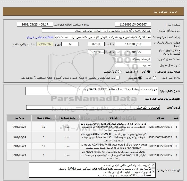 نام دستگاه خریدار:شرکت پالایش گاز شهید هاشمی نژاد استان خراسان رضوی