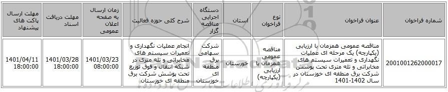 | 2001001262000017 | مناقصه عمومی همزمان با ارزیابی (یکپارچه) یک مرحله ای عملیات نگهداری و تعمیرات سیستم های مخابراتی و تله متری تحت پوشش شرکت برق منطقه ای خوزستان در سال 1402-1401 | مناقصه عمومی همزمان با ارزیابی (یکپارچه) | خوزستان | شرکت سهامی برق منطقه ای خوزستان | انجام عملیات نگهداری و تعمیرات سیستم های مخابراتی و تله متری در شبکه انتقال و فوق توزیع تحت پوشش شرکت برق منطقه ای خوزستان | 1401/03/23 08:00:00 | 1401/03/28 18:00:00 | 1401/04/11 18:00:00 |