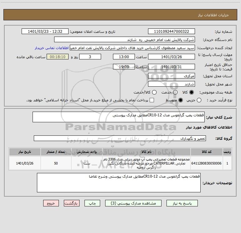 شرح کلی نیاز: قطعات پمپ گرانفوس مدل CR10-12مطابق مدارک پیوستی