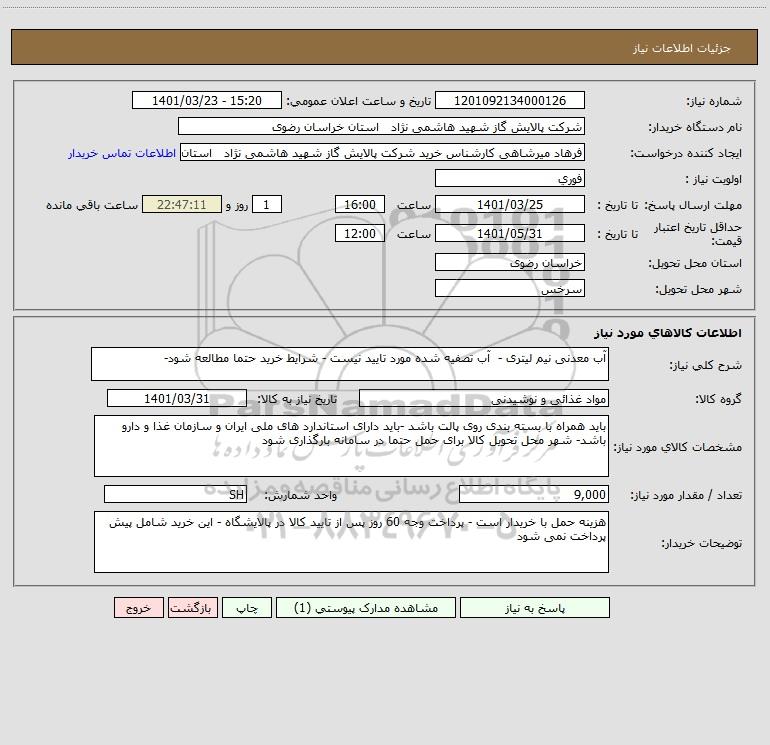 نام دستگاه خریدار:شرکت پالایش گاز شهید هاشمی نژاد استان خراسان رضوی