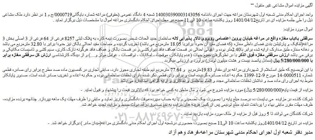 - مزایده در تاریخ 1401/04/12روز یکشنبه ساعت 10 الی11 صبح بصورت حضوری درشعبه اول اجرای احکام مدنی دادگستری مراغه(میدان مادر ) برگزار خواهد شد.