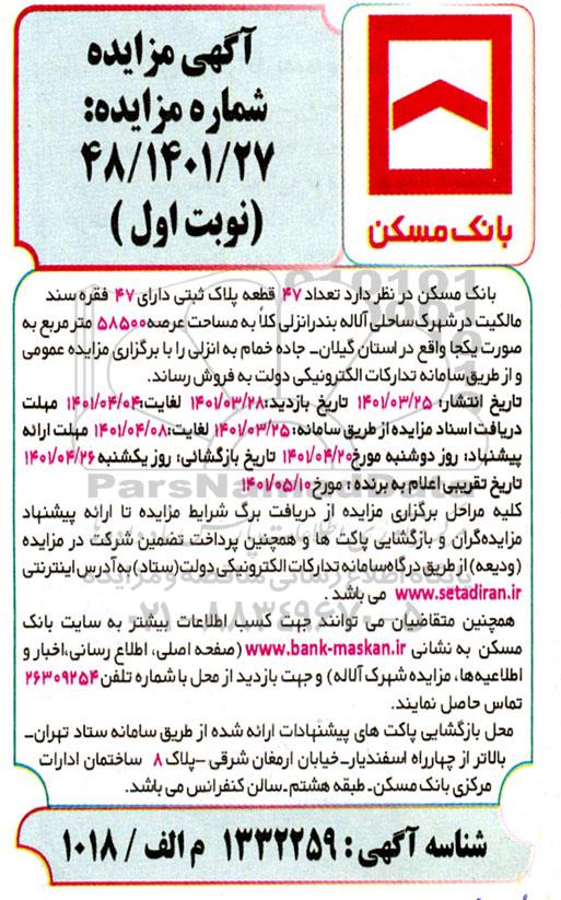 بانک مسکن در نظر دارد تعداد 47 قطعه پلاک ثبتی دارای 47 فقره سند مالکیت در شهرک ساحلی آلاله بندرانزلی کلا به مساحت عرصه 58500 متر مربع به صورت یکجا واقع در استان گیلان - جاده خمام به انزلی را با برگزاری مزایده عمومی و از طریق سامانه تدارکات الکترونیکی دولت به فروش رساند