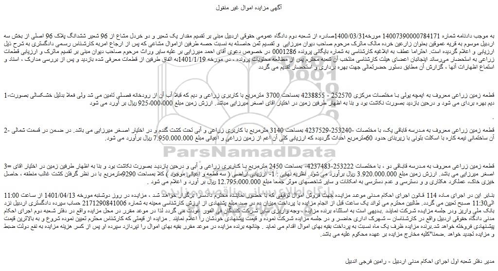 به موجب دادنامه شماره 14007390000784171 مورخه1400/03/31صادره از شعبه دوم دادگاه عمومی حقوقی اردبیل مبنی بر تقسیم مقدار یک شعیر و دو خردل مشاع از 96 شعیر ششدانگ پلاک 96 اصلی از بخش سه اردبیل موسوم به قریه عموقین بعنوان زارعین خرده مالک ماترک مرحوم صاحب دیوان مبرزایی و تقسیم ثمن حاصله به نسبت حصه طرفین ازاموال مشاعی که پس از ارجاع امربه کارشناس رسمی دادگستری به شرح ذیل ارزیابی و اعلام گردیده است. احتراما عطف به ابلاغیه کارشناسی به شماره بایگانی پرونده 0001286 در خصوص دعوی آقای احمد میرزایی بر علیه سایر وراث مرحوم صاحب دیوان مبنی بر تقسیم ماترک و ارزیابی قطعات زراعی به استحضار می رساند اینجانبان اعضای هیئت کارشناسی منتخب آن شعبه محترم پس از مطالعه محتویات پرونده ، در مورخه 1401/1/19به اتفاق طرفین از قطعات معرفی شده بازدید و پس از بررسی مدارک ، اسناد و استماع اظهارات آنها ، گزارش آن مطابق دستور حضرتعالی جهت بهره برداری و استحضار تقدیم می گردد