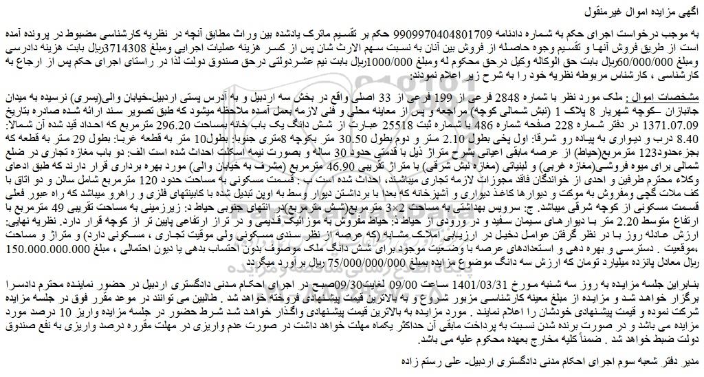 شعبه صادر کننده:شعبه سوم اجرای احکام مدنی دادگستری شهرستان اردبیل