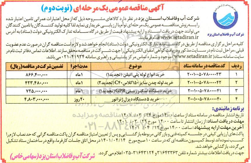 شرکت آب و فاضلاب استان یزد در نظر دارد کالاهای مشروحه ذیل از محل اعتبارات عمرانی تامین اعتبار شده را به روش مناقصه عمومی یک مرحله ای توأم با ارزیابی خریداری نماید لذا کلیه تولید کنندگان یا ترمیم کنندگان می توانند جهت دریافت اسناد و ارائه پیشنهاد قیمت از طریق درگاه سامانه تدارکات الکترونیکی دولت ستاد به آدرس سامانه ستاد اقدام فرمایند کلیه مراحل برگزاری مناقصه از طریق درگاه سامانه تدارکات الکترونیک دولت ستاد انجام خواهد شد و لازم است مناقصه گران در صورت عدم اسکیت قبلی مراحل ثبت نام در سایت مذکور و دریافت گواهی امضای الکترونیکی را جهت شرکت در مناقصه محک حقوق سازند اطلاعات تماس دفاتر ثبت نام در سایت سامانه ستاد موجود و شماره تماس مرکز پشتیبانی و راهبری سامانه 41934-021 می باشد