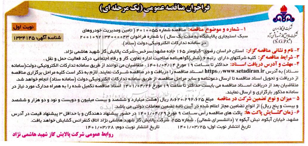 1- شماره و موضوع مناقصه: مناقصه شماره 4010055 (تامین و مدیریت خودروهای سبک استیجاری پالایشگاه به مدت یک سال)- با شماره فراخوان 2099092134000043 در سامانه تدارکات الکترونیکی دولت