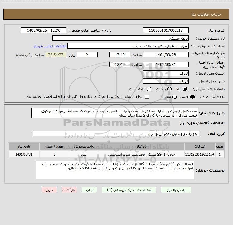 شرح کلی نیاز: ست کامل لوازم تحریر اداری مطابق با لیست و برند اعلامی در پیوست. ایران کد مشابه. پیش فاکتور فوق قیمت گذاری و در سامانه بارگزاری گردد.ارسال نمونه
