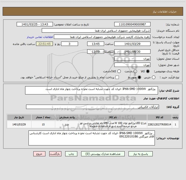 شرح کلی نیاز: پرژکتور IP66-SMD 1000W -ایران کد جهت تشابه است نحو ه پرداخت چهار ماه اداری است
