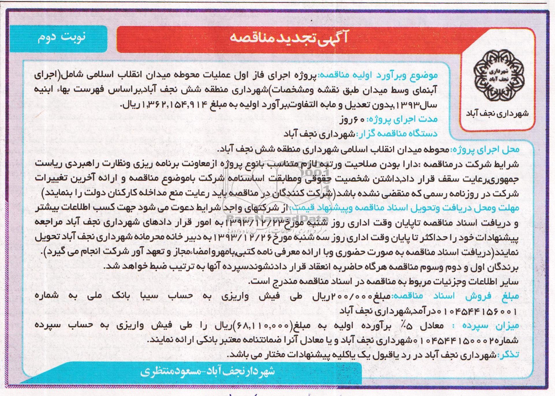 موضوع و برآورد اولیه مناقصه: پروژه اجرای فاز اول عملیات محوطه میدان انقلاب اسلامی شامل (اجرای آبنمای وسط میدان طبق نقشه و مشخصات) شهرداری منطقه شش نجف آباد، براساس فهرست بهاء ابنیه سال 1393، بدون تعدیل و مابه التفاوت، با برآورد اولیه به مبلغ 1.362.154.914 ریال