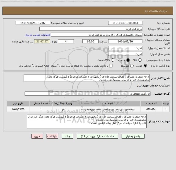 توضیحات خریدار:ارائه خدمات ممیزی : فضای سخت افزاری ( تجهیزات و امکانات موجود) و فیزیکی مرکز داده مرکز آمار ایران