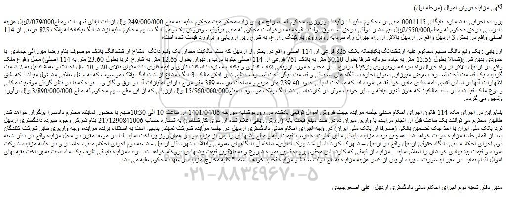 پرونده اجرایی به شماره بایگانی 0001115 مبنی بر محکوم علیها : زلیخا نوروزی، محکوم له :سراج مهدی زاده محکو میت محکوم علیه به مبلغ 249/000/000 ریال ازبابت ایفای تعهدات ومبلغ2/079/000ریال هزینه دادرسی درحق محکوم له ومبلغ2/550/000ریال نیم عشر دولتی درحق صندوق دولت،باتوجه به درخواست محکوم له مبنی برتوقیف وفروش یک ونیم دانگ سهم محکوم علیه ازششدانگ یکبابخانه پلاک 825 فرعی از 114 اصلی واقع در بخش 3 اردبیل واقع در اردبیل بالاتر از راه جیرال راه سردابه روبرروی پارکینگ زارع، به شرح زیر ارزیابی و برآورد قیمت شده است؛