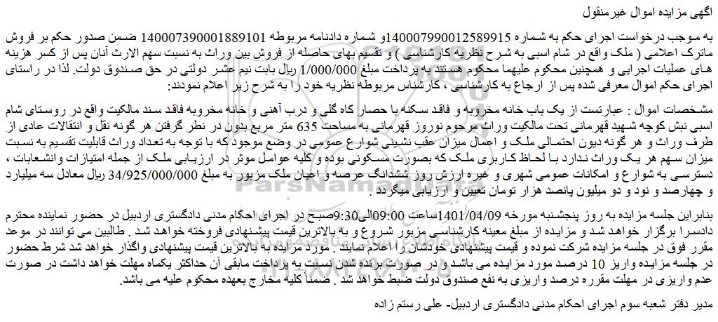 به موجب درخواست اجرای حکم به شماره 140007990012589915و شماره دادنامه مربوطه 140007390001889101 ضمن صدور حکم بر فروش ماترک اعلامی ( ملک واقع در شام اسبی به شرح نظریه کارشناسی ) و تقسیم بهای حاصله از فروش بین وراث به نسبت سهم الارث آنان پس از کسر هزینه های عملیات اجرایی و همچنین محکوم علیهما محکوم هستند به پرداخت مبلغ 1/000/000 ریال بابت نیم عشر دولتی در حق صندوق دولت. لذا در راستای اجرای حکم اموال معرفی شده پس از ارجاع به کارشناسی ، کارشناس مربوطه نظریه خود را به شرح زیر اعلام نمودند: