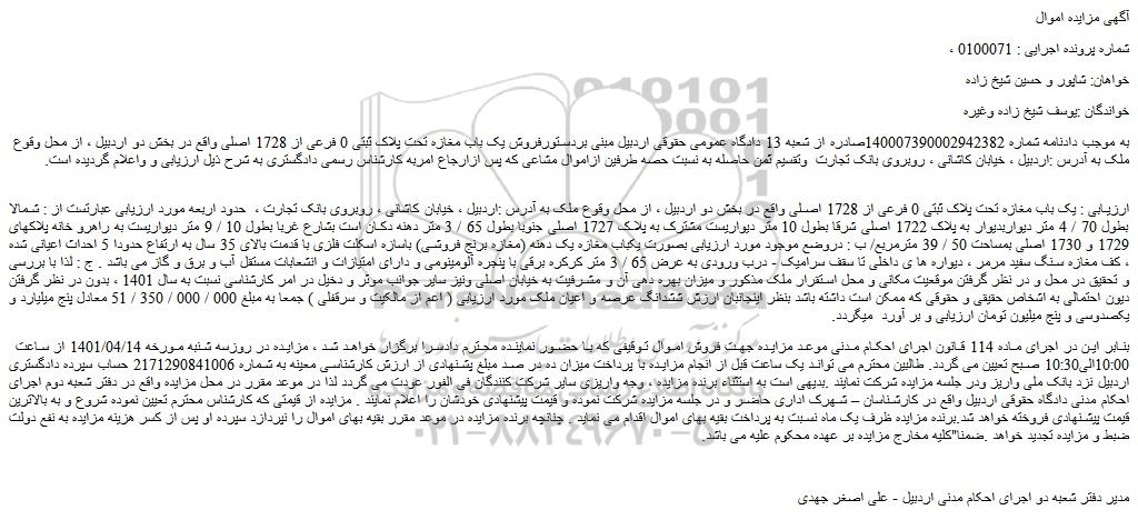 به موجب دادنامه شماره 140007390002942382صادره از شعبه 13 دادگاه عمومی حقوقی اردبیل مبنی بردستورفروش یک باب مغازه تحت پلاک ثبتی 0 فرعی از 1728 اصلی واقع در بخش دو اردبیل ، از محل وقوع ملک به آدرس :اردبیل ، خیابان کاشانی ، روبروی بانک تجارت وتقسیم ثمن حاصله به نسبت حصه طرفین ازاموال مشاعی که پس ازارجاع امربه کارشناس رسمی دادگستری به شرح ذیل ارزیابی و واعلام گردیده است.