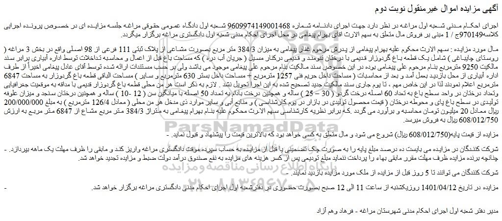 مال مورد مزایده : سهم الارث محکوم علیه بهرام پیغامی از پدرش مرحوم غفار پیغامی به میزان 384/3 متر مربع بصورت مشاعی از پلاک ثبتی 111 فرعی از 98 اصلی واقع در بخش 3 مراغه ( روستای چایباغی ) شامل یک قطعه باغ گردوزار قدیمی با درختان تنومند و قدیمی درکنار مسیل ( جریان آب دره ) که مساحت باغ قبل از اعمال و محاسبه تداخلات توسط اداره آبیاری برابر سند مالکیت 9250 مترمربع بنام مرحوم علی پیغامی بوده در این خصوص سند مالکیت بنام مرحوم علی پیغامی موجود می باشد ولی بر حسب مستندات ارائه شده توسط آقای عادل پیغامی اخیراً از طرف اداره آبیاری از محل بازدید بعمل آمد و بعد از محاسبات ( مساحت داخل حریم فنی 1257 مترمربع + مساحت داخل بستر 630 مترمربع و سایر ) مساحت الباقی قطعه باغ گردوزار به مساحت 6847 مترمربع اعلام نمودند لذا در این خاص مهم ، تا یوم جاری سند مالکیت جدید تصحیح شده به این اجرا تحویل نشد . لازم به ذکر است هر من محلی قطعه باغ گردوزار قدیمی با مداقه به موقعیت جغرافیایی وتعداد درختان در واحد سطح باغ به تعداد 60 اصله درخت گردو ( 30 – 25 ) ساله و همچنین درخت بادام به تعداد 50 اصله با میانگین سن ( 12 -10 ) ساله و همچنین درختان سنجد و میزان علوفه تولیدی در سطح باغ پای و محوطه درختان ( قیمت محصول تولیدی در بازار در یوم کارشناسی ) و منابع آبی و سایر موارد ذی مدخل هر من محلی ( معادل 126/4 مترمربع ) به مبلغ 200/000/000 ریال معادل 20 میلیون تومان محاسبه و برآورد می گردد .که برابر نظریه کارشناسی سهم الارث محکوم علیه بنام بهرام پیغامی به متراژ 384/3 متر مربع مشاع از 6847 متر مربع به ارزش 608/012/750 ریال به فروش میرسد.