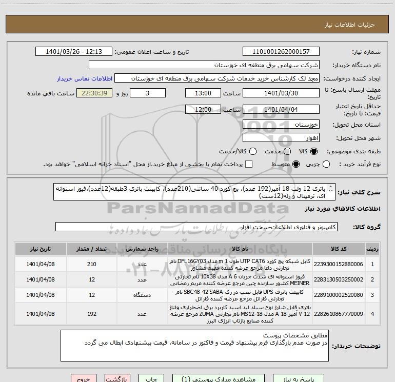 شرح کلی نیاز: باتری 12 ولت 18 آمپر(192 عدد)، پچ کورد 40 سانتی(210عدد)، کابینت باتری 3طبقه(12عدد)،فیوز استوانه ای، ترمینال و رله(12ست)