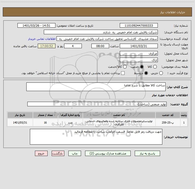 شرح کلی نیاز: ساخت کالا مطابق با شرح تقاضا