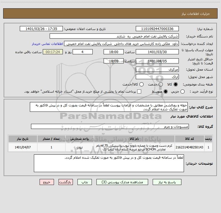 شرح کلی نیاز: حوله و روبالشی مطابق با مشخصات و الزامات پیوست لطفاً در سامانه قیمت بصورت کل و در پیش فاکتور به صورت تفکیک شده اعلام گردد.