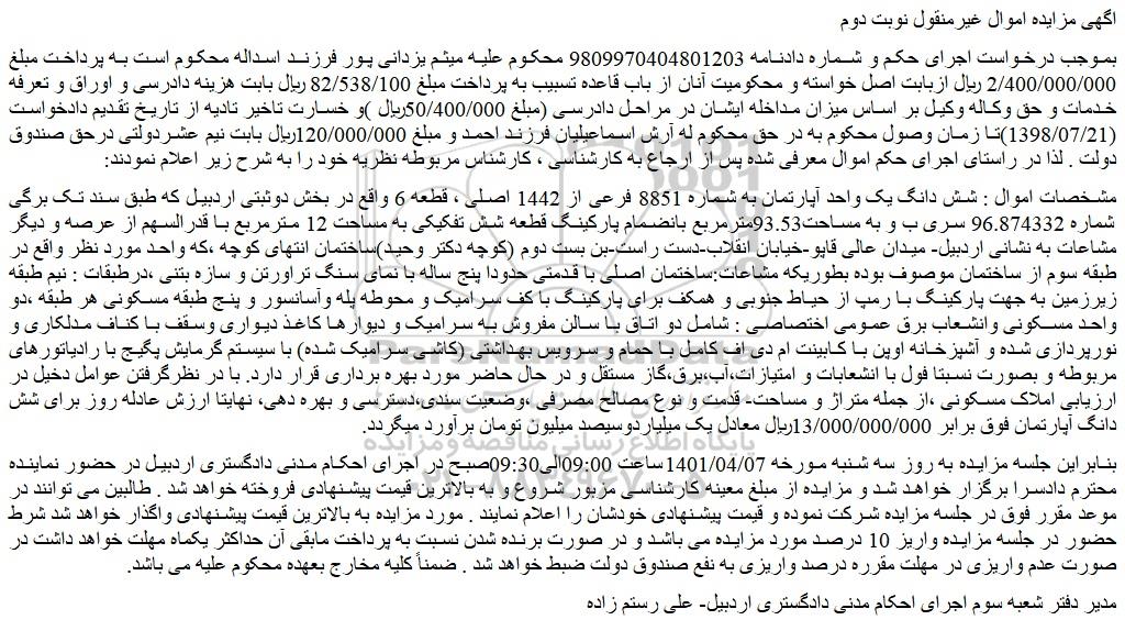 بنابراین جلسه مزایده به روز سه شنبه مورخه 1401/04/07ساعت 09:00الی09:30صبح در اجرای احکام مدنی دادگستری اردبیل در حضور نماینده محترم دادسرا برگزار خواهد شد و مزایده از مبلغ معینه کارشناسی مزبور شروع و به بالاترین قیمت پیشنهادی فروخته خواهد شد . طالبین می توانند در موعد مقرر فوق در جلسه مزایده شرکت نموده و قیمت پیشنهادی خودشان را اعلام نمایند . مورد مزایده به بالاترین قیمت پیشنهادی واگذار خواهد شد شرط حضور در جلسه مزایده واریز 10 درصد مورد مزایده می باشد و در صورت برنده شدن نسبت به پرداخت مابقی آن حداکثر یکماه مهلت خواهد داشت در صورت عدم واریزی در مهلت مقرره درصد واریزی به نفع صندوق دولت ضبط خواهد شد . ضمناً کلیه مخارج بعهده محکوم علیه می باشد.