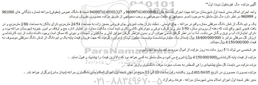 واحد اجرای احکام مدنی شعبه اول شهرستان مراغه جهت اجرای دادنامه های 9609974149300493 و 9409974149301327 شعبه 4 دادگاه عمومی (حقوقی) مراغه شماره بایگانی های 961000 و 960999 در نظر دارد مال ذیل متعلق به مرحوم ناصر سجوقچی و طلعت سوجوقچی و رجب سجوقچی از طریق مزایده حضوری بفروش برساند: