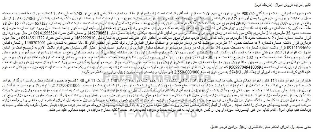 شماره پرونده اجرایی: به شماره بایگانی 980526 مبنی بر ارزیابی سهم الارث محکوم علیه آقای کرامت نعمت زاده اجیرلو از ملک به شماره پلاک ثبتی 3 فرعی از 5748 اصلی بخش 1 اینجانب پس از مطالعه پرونده معاینه محل و تحقیقات و بررسی های فنی را بعمل آورده و گزارش کارشناسی را به شرح ذیل به استحضار می رساند بر اساس مدارک موجود در اداره ثبت اسناد و املاک اردبیل ملک به شماره پلاک ثبتی 5748/3 بخش 1 اردبیل واقع در اردبیل خیابان بهشت فاطمه به مساحت 129/70مترمربع می باشد که شش دانگ عرصه و اعیان به نام آقای یوسف نعمت زاده اجیرلو به ثبت رسیده است سند مالیکت المثنی به شماره 657127 سری الف 16 سال 88 ملک مذکور یک ساختمان دو طبقه با اسکلت فلزی و دیوارهای آجر قشاری می باشد که در طبقه همکف چهار باب مغازه و راه پله ورودی به طبقه اول و طبقه اول مسکونی با مشخصات ذیل وجود دارد مغازه شماره 1 به مساحت حدود 35 مترمربع با 2 مترمربع بالکن می باشد که در زمان بازدید برای سنگ تراشی در اختیار آقای سعید میکائیل زاده به شماره ملی 1462708651 و شماره تلفن همراه 09141555524 در حال بهره برداری قرار داشت. مغازه شماره 2 به مساحت حدود 18 مترمربع می باشد که در زمان بازدید بعنوان سوپر مارکت در اختیار آقای علیرضا نصیری به شماره ملی 1462922910 و شماره تلفن همراه 09143511722 در حال بهره برداری قرار داشت. مغازه شماره 3 به مساحت حدود 24 مترمربع می باشد که در زمان بازدید برای استفاده بعنوان انباری لوازم لوله کشی در اختیار آقای گل بابا اسحقی به شماره ملی 1460702001 و شماره تماس 09141534669 قرار داشت. مغازه شماره 4 به مساحت حدود 24 متر مربع که در زمان بازدید برای استفاده بعنوان انباری لوازم یکیار مصرف در اختیار آقای سلیمان حقی قرار داشت. لازم به توضیح است بر اساس اظهارات افراد فوق الذکر سرقفلی مغازه ها به نامبردگان واگذار شده است لذا در تعیین سهم الارث محکوم علیه، ارزش روز حق مالکانه لحاظ می گردد. واحد مسکونی واقع در طبقه اول با دیوار های آجری و پنجره های آلومینیوم بدون سنگ نما به مساحت حدود 132 مترمربع با قدمت حدود 30 سال که در زمان بازدید در حال بهره برداری بود. لذا با توجه موقعیت، مساحت، نحوه دسترسی به شارع، قدمت، ارزش منطقه ای ارزش بهره دهی و سایر عوامل موثر در کارشناسی و همچنین لحاظ ارزش روز حق مالکانه مغازه های فوق الذکر و ارزش روز واحد مسکونی با قدرالسهم از عرصه و توجهاً به گواهی حصر وراثت صادره از شعبه 11 شورای حل اختلاف شهرستان اردبیل به شماره دادنامه 9509970494100691 که در آن سهم الارث آقای کرامت نعمت زاده از ماترک مرحوم یوسف نعمت زاده به نسبت دو بیست و یکم مشخص شده است قیمت پایه مزایده سهم الارث محکوم علیه آقای کرامت نعمت زاده اجیرلو از پلاک ثبتی 5748/3 به شرح فوق به مبلغ 2/550/000/000 (دو میلیارد و پانصدو پنجاه میلیون ) ریال برآورد و اعلام می گردد.